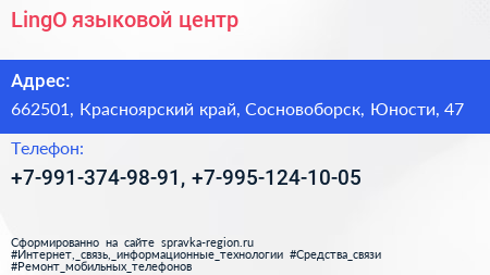 LingO, языковой центр по адресу 662501, Красноярский край, Сосновоборск, Юности, 47 в дальнейшем Организация, размещена в следующих категориях: