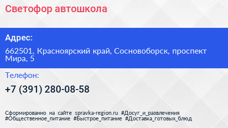 Светофор, автошкола по адресу 662501, Красноярский край, Сосновоборск, проспект Мира, 5 в дальнейшем Организация, размещена в следующих категориях: