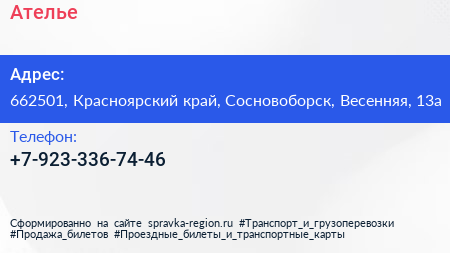 Ателье по адресу 662501, Красноярский край, Сосновоборск, Весенняя, 13а в дальнейшем Организация, размещена в следующих категориях: