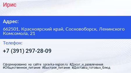 Ирис по адресу 662501, Красноярский край, Сосновоборск, Ленинского Комсомола, 21 в дальнейшем Организация, размещена в следующих категориях: