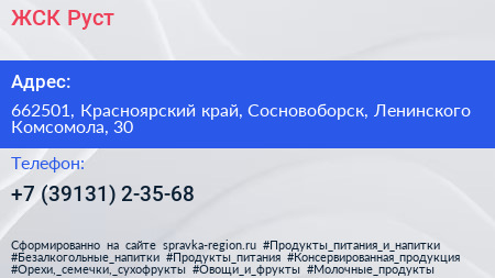 ЖСК Руст по адресу 662501, Красноярский край, Сосновоборск, Ленинского Комсомола, 30 в дальнейшем Организация, размещена в следующих категориях: