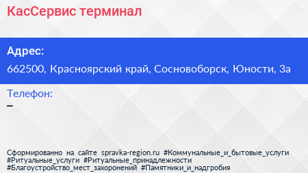 КасСервис, терминал по адресу 662500, Красноярский край, Сосновоборск, Юности, 3а в дальнейшем Организация, размещена в следующих категориях: