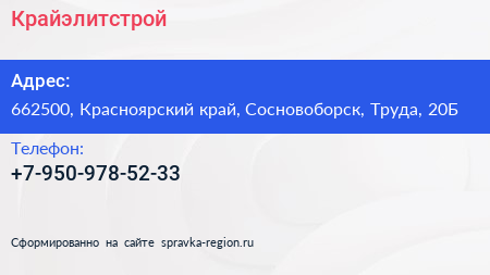 Крайэлитстрой по адресу 662500, Красноярский край, Сосновоборск, Труда, 20Б в дальнейшем Организация, размещена в следующих категориях: