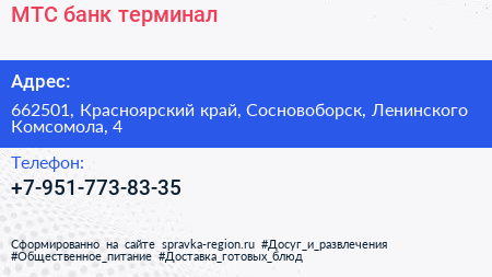 МТС банк, терминал по адресу 662501, Красноярский край, Сосновоборск, Ленинского Комсомола, 4 в дальнейшем Организация, размещена в следующих категориях: