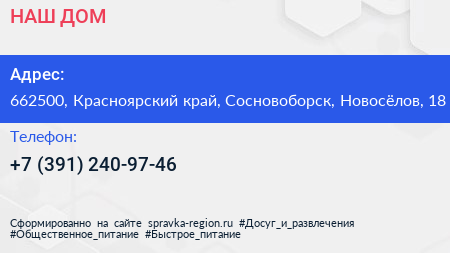 НАШ ДОМ по адресу 662500, Красноярский край, Сосновоборск, Новосёлов, 18 в дальнейшем Организация, размещена в следующих категориях: