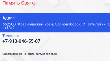 Память-Свята по адресу 662500, Красноярский край, Сосновоборск, 9 Пятилетки, 1 ст13/2 в дальнейшем Организация, размещена в следующих категориях: