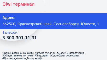 Qiwi, терминал по адресу 662500, Красноярский край, Сосновоборск, Юности, 1 в дальнейшем Организация, размещена в следующих категориях: