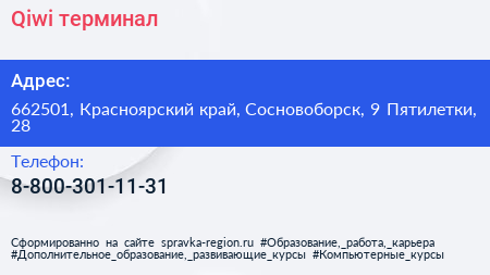 Qiwi, терминал по адресу 662501, Красноярский край, Сосновоборск, 9 Пятилетки, 28 в дальнейшем Организация, размещена в следующих категориях: