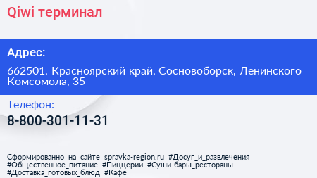 Qiwi, терминал по адресу 662501, Красноярский край, Сосновоборск, Ленинского Комсомола, 35 в дальнейшем Организация, размещена в следующих категориях: