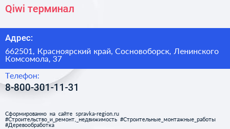 Qiwi, терминал по адресу 662501, Красноярский край, Сосновоборск, Ленинского Комсомола, 37 в дальнейшем Организация, размещена в следующих категориях: