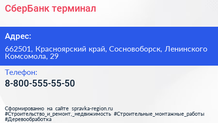 СберБанк, терминал по адресу 662501, Красноярский край, Сосновоборск, Ленинского Комсомола, 29 в дальнейшем Организация, размещена в следующих категориях: