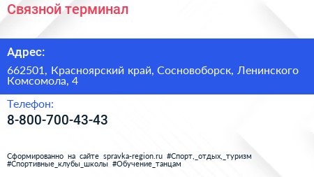 Связной, терминал по адресу 662501, Красноярский край, Сосновоборск, Ленинского Комсомола, 4 в дальнейшем Организация, размещена в следующих категориях: