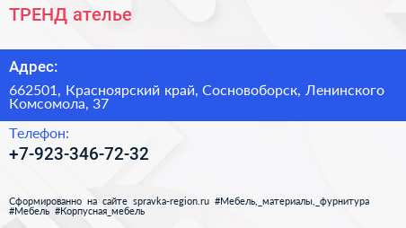 ТРЕНД, ателье по адресу 662501, Красноярский край, Сосновоборск, Ленинского Комсомола, 37 в дальнейшем Организация, размещена в следующих категориях:
