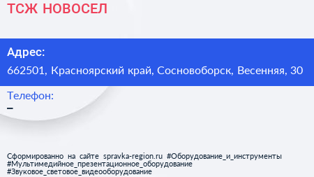 ТСЖ НОВОСЕЛ по адресу 662501, Красноярский край, Сосновоборск, Весенняя, 30 в дальнейшем Организация, размещена в следующих категориях: