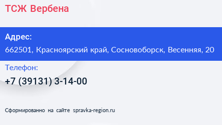 ТСЖ Вербена по адресу 662501, Красноярский край, Сосновоборск, Весенняя, 20 в дальнейшем Организация, размещена в следующих категориях: