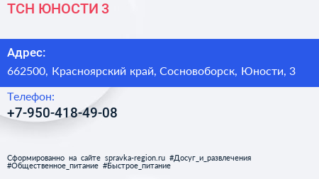 ТСН ЮНОСТИ 3 по адресу 662500, Красноярский край, Сосновоборск, Юности, 3 в дальнейшем Организация, размещена в следующих категориях: