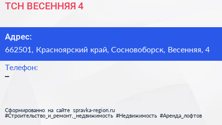 ТСН ВЕСЕННЯЯ-4 по адресу 662501, Красноярский край, Сосновоборск, Весенняя, 4 в дальнейшем Организация, размещена в следующих категориях: