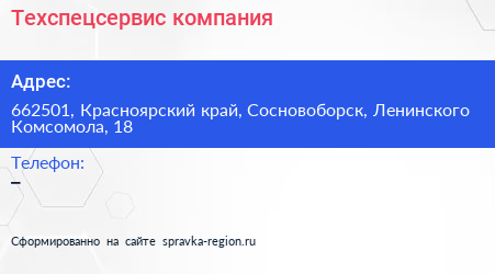 Техспецсервис, компания по адресу 662501, Красноярский край, Сосновоборск, Ленинского Комсомола, 18 в дальнейшем Организация, размещена в следующих категориях: