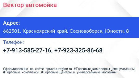 Вектор, автомойка по адресу 662501, Красноярский край, Сосновоборск, Юности, 8 в дальнейшем Организация, размещена в следующих категориях: