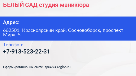 БЕЛЫЙ САД, студия маникюра по адресу 662501, Красноярский край, Сосновоборск, проспект Мира, 5 в дальнейшем Организация, размещена в следующих категориях: