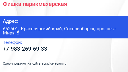 Фишка, парикмахерская по адресу 662501, Красноярский край, Сосновоборск, проспект Мира, 5 в дальнейшем Организация, размещена в следующих категориях: