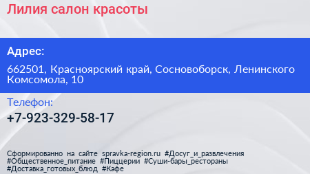 Лилия, салон красоты по адресу 662501, Красноярский край, Сосновоборск, Ленинского Комсомола, 10 в дальнейшем Организация, размещена в следующих категориях: