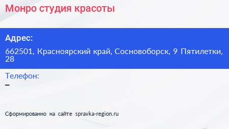 Монро, студия красоты по адресу 662501, Красноярский край, Сосновоборск, 9 Пятилетки, 28 в дальнейшем Организация, размещена в следующих категориях: