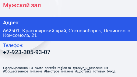 Мужской зал по адресу 662501, Красноярский край, Сосновоборск, Ленинского Комсомола, 21 в дальнейшем Организация, размещена в следующих категориях: