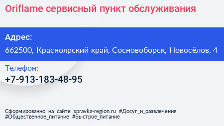 Oriflame, сервисный пункт обслуживания по адресу 662500, Красноярский край, Сосновоборск, Новосёлов, 4 в дальнейшем Организация, размещена в следующих категориях: