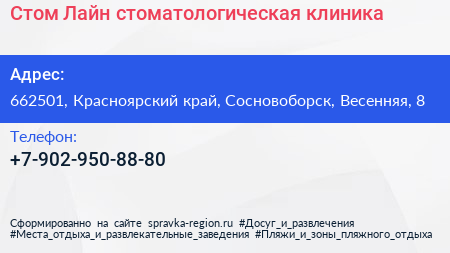 Стом-Лайн, стоматологическая клиника по адресу 662501, Красноярский край, Сосновоборск, Весенняя, 8 в дальнейшем Организация, размещена в следующих категориях: