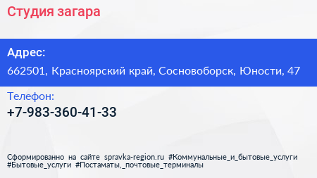 Студия загара по адресу 662501, Красноярский край, Сосновоборск, Юности, 47 в дальнейшем Организация, размещена в следующих категориях: