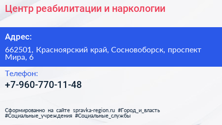 Центр реабилитации и наркологии по адресу 662501, Красноярский край, Сосновоборск, проспект Мира, 6 в дальнейшем Организация, размещена в следующих категориях: