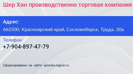 Шер-Хан, производственно-торговая компания по адресу 662500, Красноярский край, Сосновоборск, Труда, 20а в дальнейшем Организация, размещена в следующих категориях: