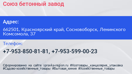 Союз, бетонный завод по адресу 662501, Красноярский край, Сосновоборск, Ленинского Комсомола, 37 в дальнейшем Организация, размещена в следующих категориях:
