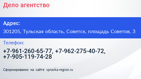 Дело, агентство по адресу 301205, Тульская область, Советск, площадь Советов, 3 в дальнейшем Организация, размещена в следующих категориях: