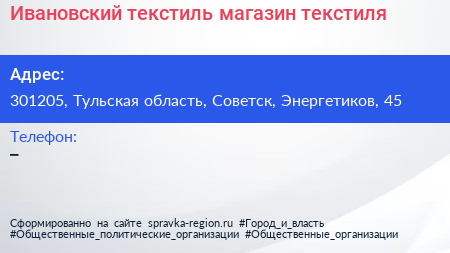 Ивановский текстиль, магазин текстиля по адресу 301205, Тульская область, Советск, Энергетиков, 45 в дальнейшем Организация, размещена в следующих категориях: