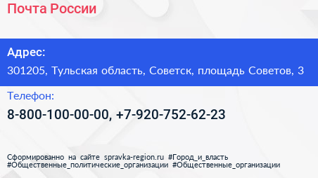 Почта России по адресу 301205, Тульская область, Советск, площадь Советов, 3 в дальнейшем Организация, размещена в следующих категориях: