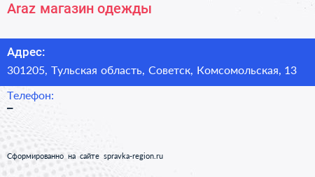Araz, магазин одежды по адресу 301205, Тульская область, Советск, Комсомольская, 13 в дальнейшем Организация, размещена в следующих категориях: