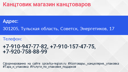 Канцтовик, магазин канцтоваров по адресу 301205, Тульская область, Советск, Энергетиков, 17 в дальнейшем Организация, размещена в следующих категориях: