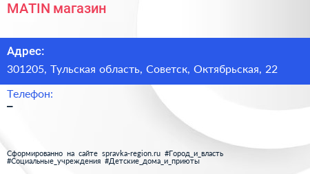 MATIN, магазин по адресу 301205, Тульская область, Советск, Октябрьская, 22 в дальнейшем Организация, размещена в следующих категориях: