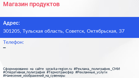 Магазин продуктов по адресу 301205, Тульская область, Советск, Октябрьская, 37 в дальнейшем Организация, размещена в следующих категориях: