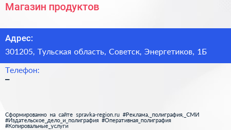 Магазин продуктов по адресу 301205, Тульская область, Советск, Энергетиков, 1Б в дальнейшем Организация, размещена в следующих категориях: