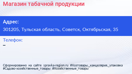 Магазин табачной продукции по адресу 301205, Тульская область, Советск, Октябрьская, 35 в дальнейшем Организация, размещена в следующих категориях: