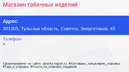 Магазин табачных изделий по адресу 301205, Тульская область, Советск, Энергетиков, 45 в дальнейшем Организация, размещена в следующих категориях: