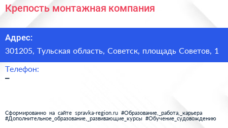 Крепость, монтажная компания по адресу 301205, Тульская область, Советск, площадь Советов, 1 в дальнейшем Организация, размещена в следующих категориях: