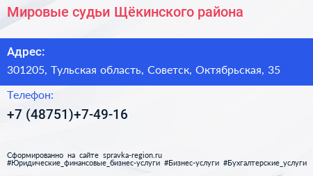 Мировые судьи Щёкинского района по адресу 301205, Тульская область, Советск, Октябрьская, 35 в дальнейшем Организация, размещена в следующих категориях: