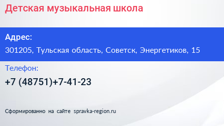Детская музыкальная школа по адресу 301205, Тульская область, Советск, Энергетиков, 15 в дальнейшем Организация, размещена в следующих категориях: