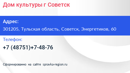Дом культуры, г. Советск по адресу 301205, Тульская область, Советск, Энергетиков, 60 в дальнейшем Организация, размещена в следующих категориях: