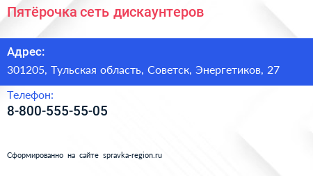 Пятёрочка, сеть дискаунтеров по адресу 301205, Тульская область, Советск, Энергетиков, 27 в дальнейшем Организация, размещена в следующих категориях: