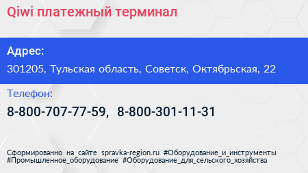 Qiwi, платежный терминал по адресу 301205, Тульская область, Советск, Октябрьская, 22 в дальнейшем Организация, размещена в следующих категориях: